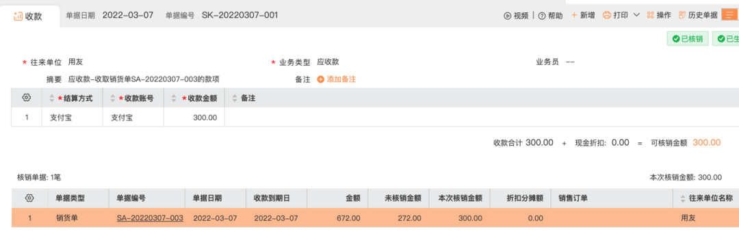 点开销货单进行付款核销,
