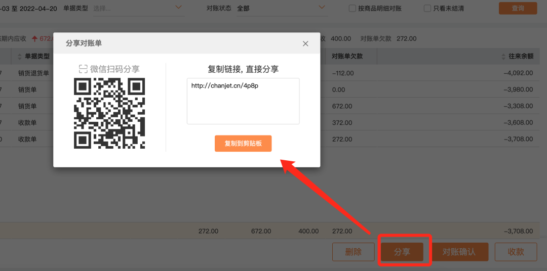 账单打开后一键分享给客户,